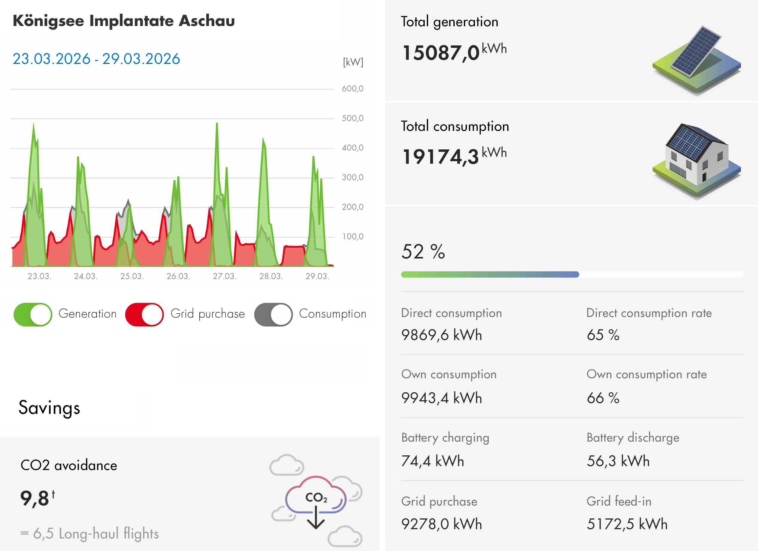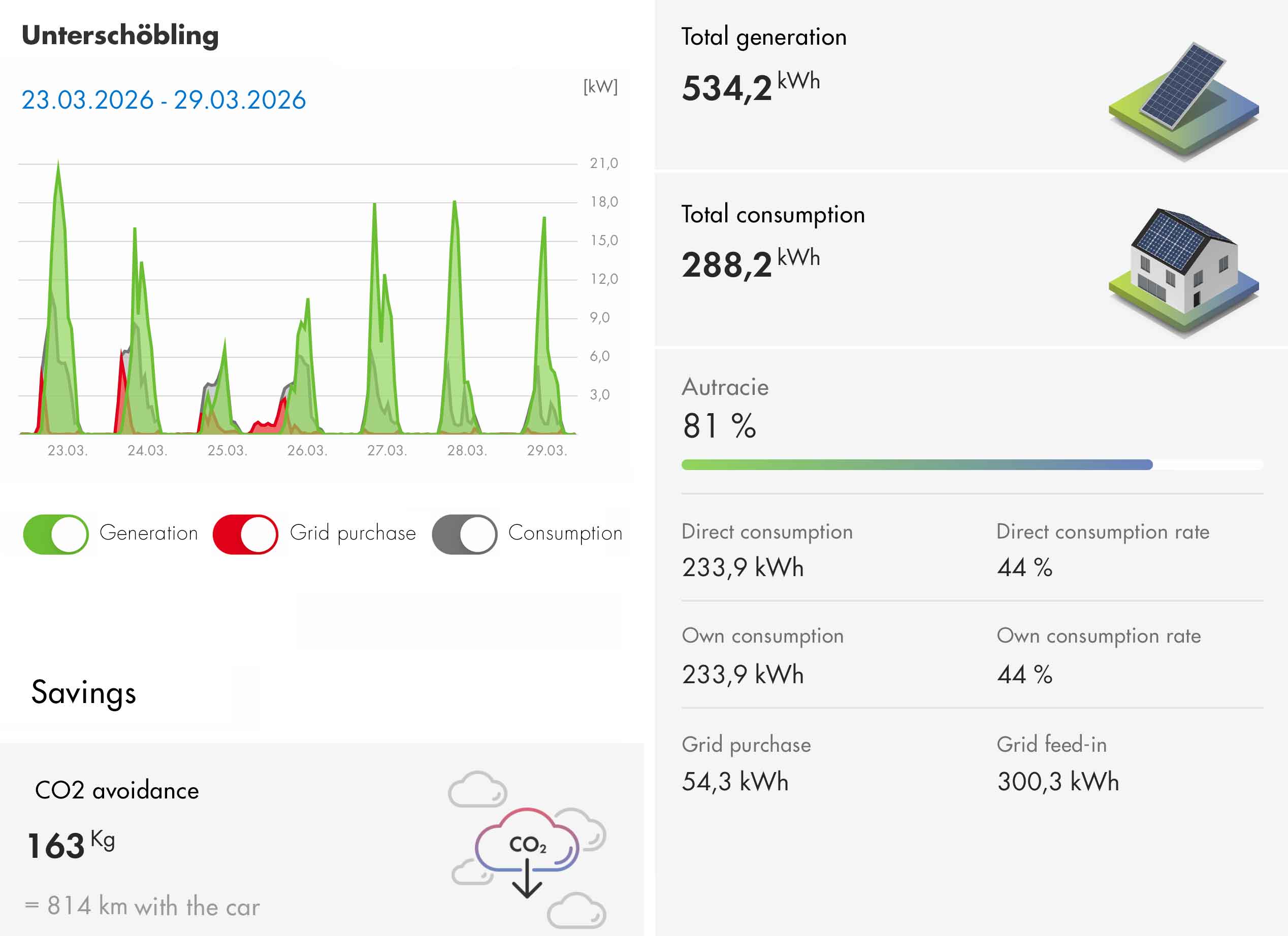 With the help of our photovoltaic systems, we generate electricity from renewable energies that is used for in-house production. Surplus energy from peak times is fed into the grid. The weekly profile of our solar park shows exactly when our own electricity was generated (green areas), electricity was consumed (grey areas) and electricity was drawn from the grid.