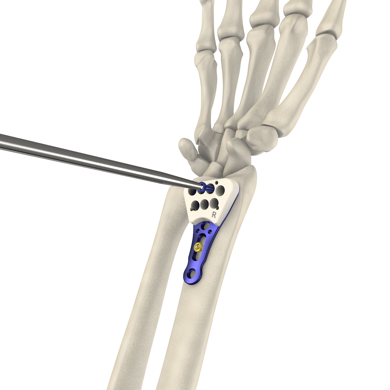 Im nächsten Entwicklungsschritt entstand die variabel winkelstabile distale Radiusplatte 2.7 mit Dr. med. Klaus-Jürgen Maier. Hierbei lag das Augenmerk auf der Verwendung der dünneren Schrauben im Plattenschaft. Desweiteren wurde eine zweireihige Schraubenanordnung im Kopfbereich geschaffen, um auch Kleinfragmente fixieren zu können. Die Platten gibt es mit zwei verschiedenen Kopfbreiten, die schmale Variante mit 5 Kopflöchern und die breite Variante mit 7 Kopflöchern. Die Schrauben können in einem Winkel von ± 15° schwenkbar eingebracht werden.