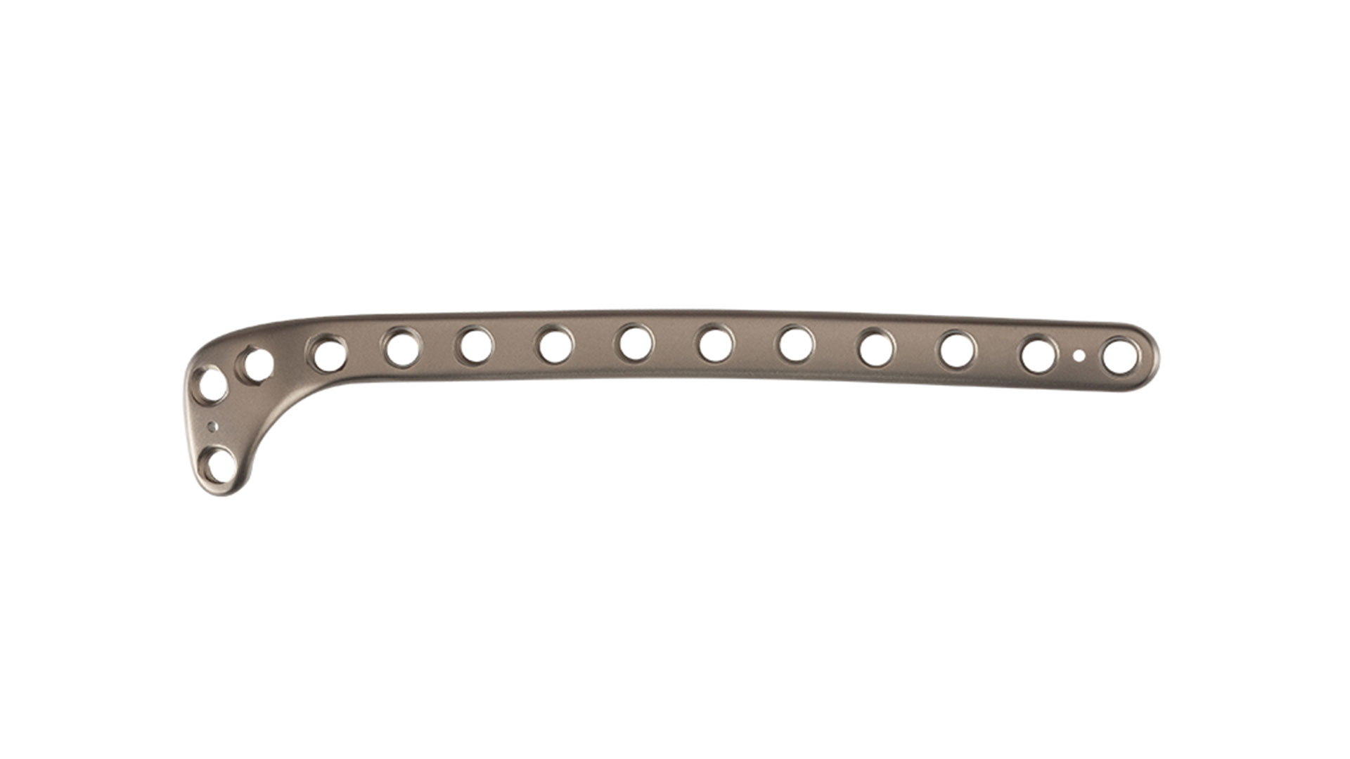 - Dos tornillos en la rama proximal transversal de la placa para una distribución óptima de la fuerza y el apoyo de los fragmentos de impresión cercanos a la articulación